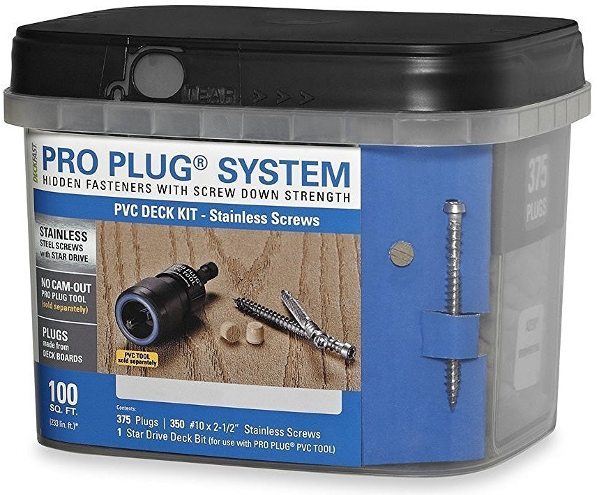 - 100 sq ft Package Contents: (375) plugs, (350) screws, (1) Pro Plug PVC tool, (2) deck bits